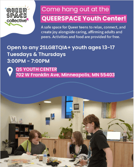The QUEERSPACE Youth Center in Minneapolis hosts biweekly drop-in hours for 2SLGBTQIA+ teens ages 13-17 on Tuesdays and Thursdays. This is an inclusive third space where you can make Queer friends, participate in group activities, and access resources to affirm your identity. Come as you are and hang with us!