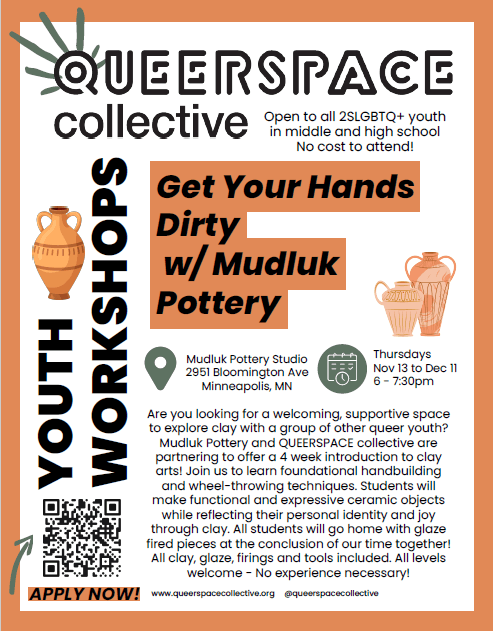 Are you looking for a welcoming, supportive space to explore clay with a group of other Queer kids? Mudluk Pottery and QUEERSPACE collective are partnering to offer a 4-week introduction to clay arts!